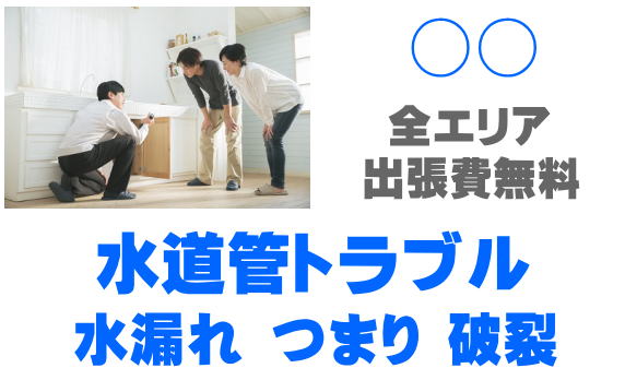 ○○で水道管の水漏れ、パイプつまり、破裂、凍結、漏水などのトラブルはお任せください。